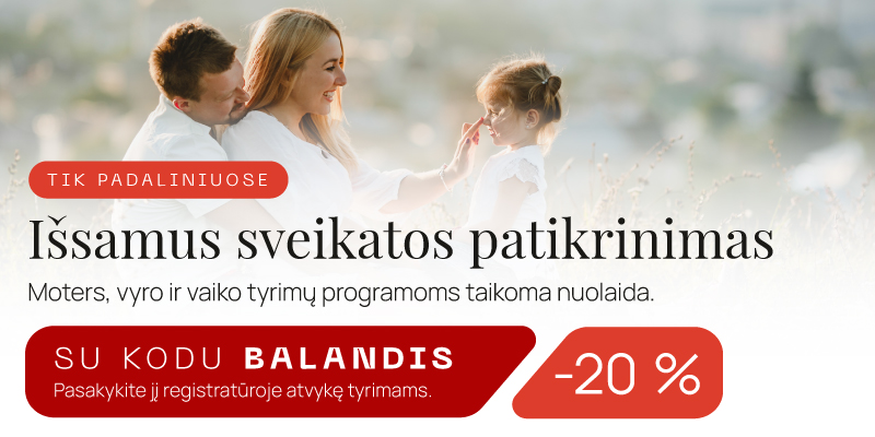 Akcija galioja šiems tyrimams: Moters-sveikatos-istyrimas, Vyro sveikatos Ištyrimas, Vaiko sveikatos ištyrimas.